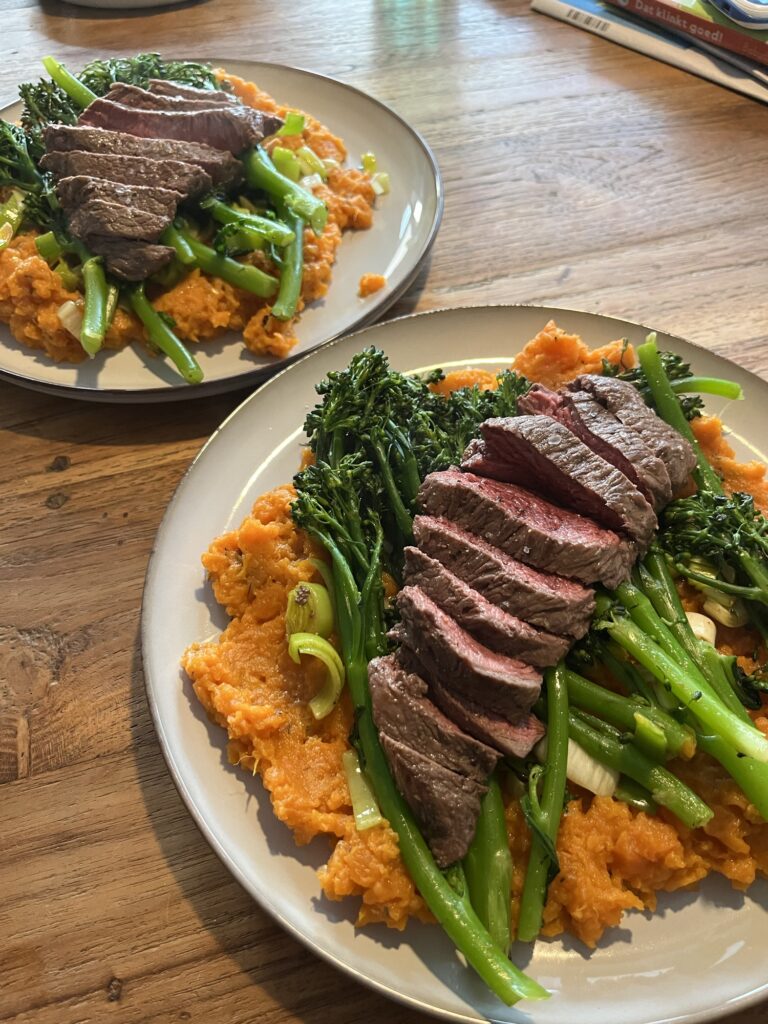 Zoete aardappelpuree met bimi en biefstuk